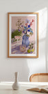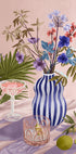 Sellel elaval natüürmortsel kunstiteosel on värviliste lilledega triibuline vaas, mida ümbritsevad troopilised lehed ja tekstuursel pinnal klaas. Kompositsioon loob harmoonilise segu loodusest ja kaasaegsest esteetikast ning lisab igasse ruumi nii värskust kui elegantsi.