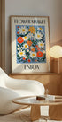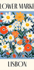 Võluv retroplakat, millel on sinisel taustal soojades oranžides, valgetes ja kollastes toonides karikakrad, moonid ja metslilled. See Lissaboni elavatest lilleturgudest inspireeritud kunstiteos jäädvustab Euroopa reisinostalgiat ja botaanilist ilu.