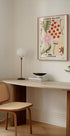 Sajandi keskpaiga stiilist inspireeritud silmatorkav plakat punaste, roosade ja kollaste graafiliste lilledega beežil taustal. Londoni elavaid lilleturge esindav hotell ühendab retrostiili botaanilise võluga.