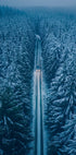 Üksildane talvetee lõikab läbi pimeda männimetsa, mis on mähitud udu ja sinaka helgiga. Kaugel ees lõhuvad vaikuse autotuled ja viivad pilgu horisondi poole, kus kohtuvad lumi ja udu. Tihe sümmeetria ja melanhoolne rahulikkus tabavad igatsust reisi järele. Foto Oskar Ulvur. Ideaalne neile, kes armastavad vaikseid talviseid maastikke.
