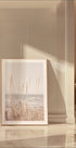 Pehme rannikufoto kõrgete õlgedega, mis õõtsuvad rannajoonel, taustal ookean. Looduslikud beežid toonid ja rahulik horisont loovad lõõgastava atmosfääri, mis sobib ideaalselt rahulikuks, loodusest inspireeritud interjööri.