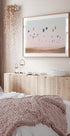 Unenäoline foto värvilistest kuumaõhupallidest, mis hõljuvad kuldsete liivaluidete kohal pastelse taeva all. Kunstiteos jäädvustab reisimise, vabaduse ja seikluse maagiat, muutes selle kauniks esemeks mis tahes ekslemishimust inspireeritud sisekujunduses.