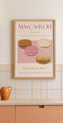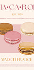 Prantsuse makaroniplakat, millel on värvilised beseepõhised koogid, mis tõstavad esile nende päritolu ja loomise 1959. aastal. Kujundusel on esile tõstetud traditsioonilised küpsetised, erksad värvid ja Prantsuse kondiitrikunst.