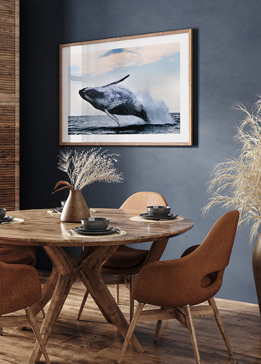 Hingemattev fotoplakat, mis jäädvustab küürvaala, kes murdub dramaatiliselt ookeanipinna kohal. Pritsiva veega õhku püütud võimas hüpe näitab looduse majesteetlikku jõudu. Ideaalne loomasõpradele, meremaastikele ja neile, kes armastavad muljetavaldavaid looduse imesid.