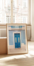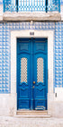 Elav foto Portugali traditsioonilisest sissepääsust Lissabonis, millel on iseloomulikud sinised plaadid ja tugev puituks. Kunstiteos tabab Euroopa linnakeskkonna võlu ning tõstab esile arhitektuuriliste detailide ja linnapärandi elegantsi.