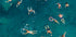 Värviline õhuvaade inimestest, kes ujuvad ja hõljuvad kristallselges türkiissinises vees. See elav suvine stseen jäädvustab vaba aja veetmise, vabaduse ja värskenduse rõõmu päikese all. Ideaalne puhkusemeeleolu esilekutsumiseks ja rannikul lõõgastumiseks.