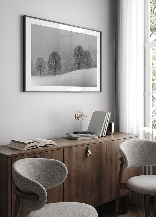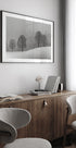 Et poetisk, monokromt vinterlandskab af Andy Dauer: En ensom træsilhuet står på en sneklædt skråning, mens tåge og let snefald svøber skov og fjerne bjerge i stille dis. Den afdæmpede kontrast og rene linjer skaber ro, melankoli og minimalistisk elegance til både stue og arbejdsrum. Et stærkt, tidløst blikfang i sort-hvid.