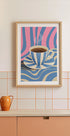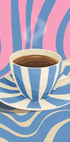 Mänguline ja särtsakas illustratsioon auravast kohvitassist alustassiga triibulises sini-valges tassis. Silmatorkav roosa ja sinine taust loob lõbusa retrohõngulise hõngu – sobib ideaalselt kööki, kohvikusse või kõigile, kes armastavad stiilset kohvihetki seinal.