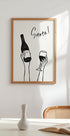 Veinipudelit ja veiniklaasi hoidvad käed kirjaga "Tervist!" prantsuse keeles plakat