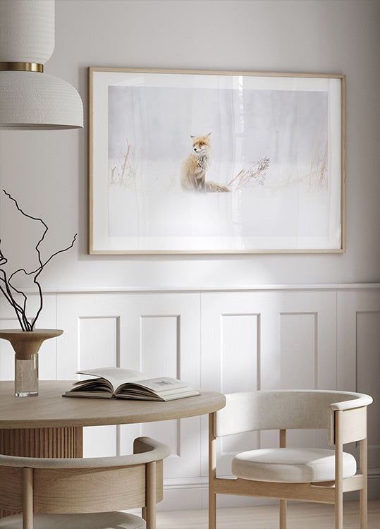 En rød ræv står stille i en frostklar skov, omkranset af fnuglet sne og dæmpet vinterlys. Stemningen er rolig og forventningsfuld—som et åndedrag før næste skridt. Waiting... af Doris Reindl indfanger naturens poesi og bringer vinterens stille magi ind i dit hjem. Perfekt til at skabe en nordisk atmosfære og et poetisk fokuspunkt året rundt.