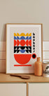 Színes, Bauhaus ihletésű poszter kávéscsészeszerűen elrendezett geometrikus formákkal. A merész piros, sárga, kék és fekete elemekkel ez a retro dizájn a 70-es évek nosztalgikus hangulatát kelti a modern belső terekbe. Tökéletes konyhákba, kávézókba vagy bárki számára, aki szereti a vintage dizájnt Bauhaus-érintéssel.