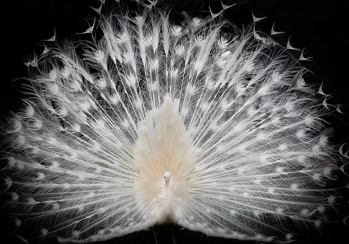 Lenyűgöző fénykép egy ritka fehér páva tollairól teljesen szétterülve, a tiszta elegancia bonyolult és finom mintáját alkotva. Ez a szemet gyönyörködtető műalkotás a szépséget, a kecsességet és a ritkaságot szimbolizálja, és minden dekoráció lenyűgöző fókuszpontjává válik.