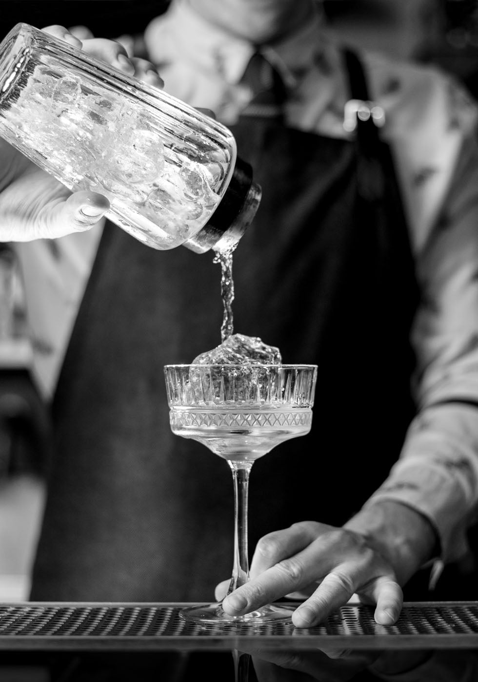 Stílusos fekete-fehér fénykép, amelyen egy csapos koktélt tölt egy klasszikus kupéspohárba. A jég szikrázik, ahogy a folyadék áramlik, és egy időtlen mixológiai jelenetet hoz létre. Tökéletes bárdíszítésnek, koktélrajongóknak vagy azoknak, akik értékelik a pultos művészetét.