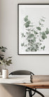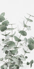 Minimalista botanikai alkotás eukaliptusz levelekkel tiszta fehér háttér előtt. A lágy árnyékok és a zöld természetes árnyalatai friss és megnyugtató falművészetet alkotnak, amely tökéletes a modern belső terekbe, a skandináv dizájnba vagy a természet ihlette terekbe.