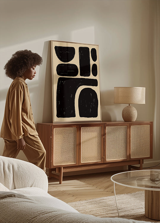 Lenyűgöző absztrakt műalkotás, merész fekete formákkal lágy bézs színű alapon. Az organikus formák és a texturált ecsetvonások modern, minimalista esztétikát teremtenek – tökéletes a kortárs belső terekhez, a galéria falaihoz, vagy bárki számára, aki szereti a letisztult, mégis művészi dizájnt.