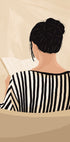 Egy meleg és hívogató illusztráció egy nőről, aki hátulról olvas csíkos felsőben. A lágy bézs tónusok és a nyugodt hangulat megnyugtató esztétikát teremtenek, így ez a tökéletes darab hálószobákba, nappalikba vagy olvasósarokba – ideális azok számára, akik szeretik a csendes pillanatokat és a hangulatos tereket.