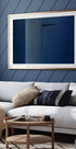 Minimalista, kék árnyalatú építészeti alkotás, amely kiemeli a geometriai formákat és a titokzatos ajtónyílást. A fény és az árnyékok elegancia és titokzatos légkört teremtenek.