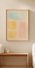 Puha és légies absztrakt műalkotás, finom sárga, rózsaszín és kék vonásokkal, meleg bézs háttéren. A nyugtató pasztell paletta a nyugalom és az egyszerűség érzetét kelti – tökéletes gyerekszobákba, hangulatos olvasósarokba vagy modern, minimalista belső terekbe.