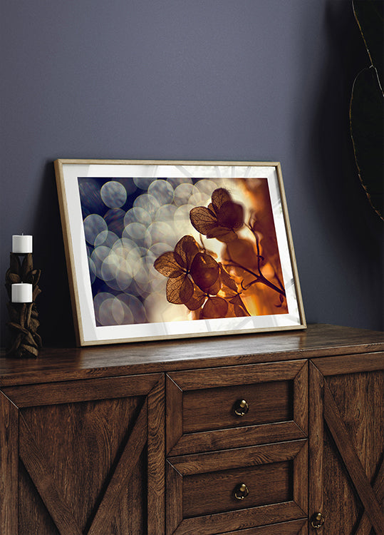 Ez a varázslatos makrófotó szárított hortenzia leveleket örökít meg meleg aranyfényben ragyogó körkörös bokeh háttér előtt. A levelek finom erei bonyolult részleteket biztosítanak, míg a világító atmoszféra eleganciát, nosztalgiát és időtlen botanikai szépséget sugároz.