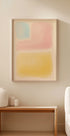Finom absztrakt műalkotás rózsaszín, sárga és kék lágy árnyalataival, meleg bézs háttéren. A légies pasztell színek megnyugtató és modern esztétikát teremtenek – ideálisak minimalista belső terekbe, gyerekszobákba vagy nyugodt galériafalakba.