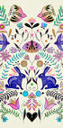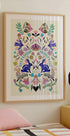 Élénk, népművészet ihlette plakát tükrös nyulakkal, madarakkal, pillangókkal és virágzó virágokkal játékos és dekoratív stílusban. Skandináv vidéki varázsával és erőteljes színeivel az illusztráció melegséget és fantáziát kölcsönöz minden enteriőrnek.