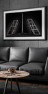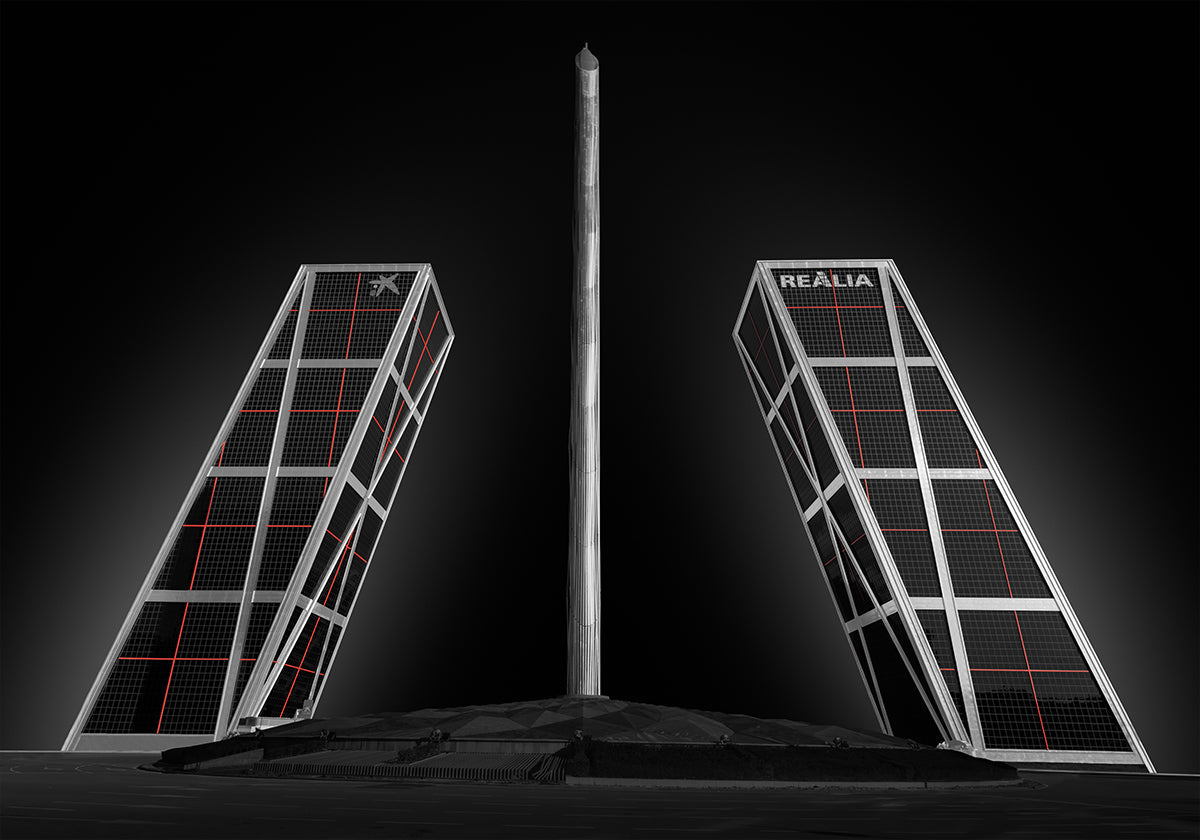 En kraftfuld, grafisk hyldest til Madrid: Rodrigo Núñez Buj indfanger de ikoniske, skrånende KIO-tårne, der vogter over en rød obelisk ved Plaza de Castilla. Monokrome flader, skarpe linjer og dybe kontraster skaber dramatisk symmetri og urban ro – en scene uden mennesker, kun arkitekturens puls. – Madrid destilleret.