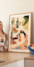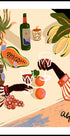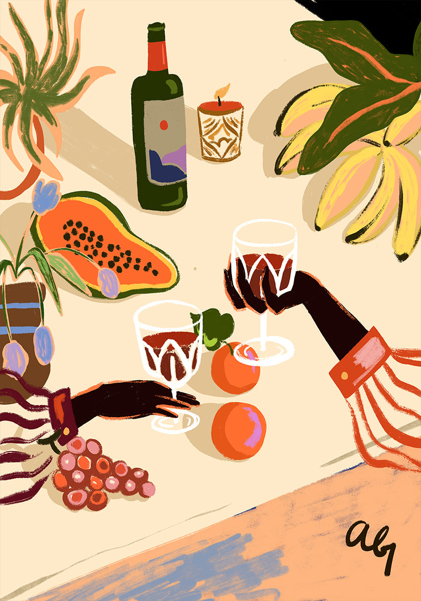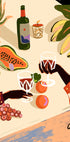 Trópusi ihletésű csendélet színes illusztrációja, borospoharakat pirító kézzel friss gyümölcsök, virágok és növények között. Erőteljes színekkel és játékos részletekkel az alkotás megragadja a társasági élet és a sörélet melegét, élénk és stílusos kijelentéssé válik.