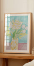 Lágy pasztell festmény virágokról vázában, finom sárga vonalakkal és zöld levelekkel megnyugtató türkiz háttér előtt. Ez a festői műalkotás friss és könnyed hangulatot kölcsönöz, tökéletes ahhoz, hogy békés virágzást varázsoljon bármely helyiségbe.