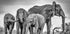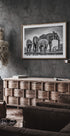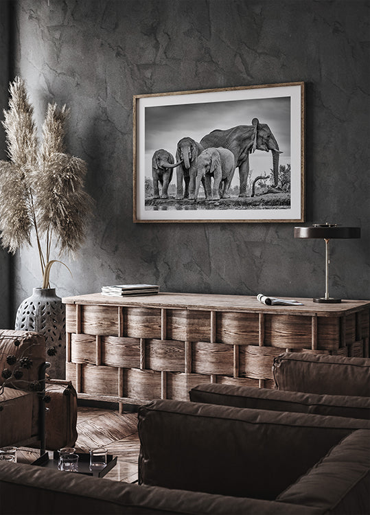 Dës mächteg schwaarz-wäiss Wildlife Foto weist eng Famill vun Elefanten, déi an engem Waasserlach versammelt sinn. Mat zaarten Interaktiounen tëscht jonken an erwuessene Elefanten, reflektéiert et Theme vu Schutz, Eenheet an der Majestéit vun der Natur - en zäitlos Konschtwierk dat Kraaft, Famill an der Wüst feiert.