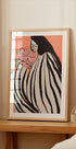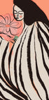 Eng dreemen a poetesch Plakat mat engem stiliséierte Portrait vun enger Fra, déi a markant schwaarz-wäiss Streifen ëmgedeckt ass, sanft eng Blummen hält. Mat sengem mëllen Peachhannergrond an expressiver Linnen kombinéiert d'Konscht Romantik, Weiblechkeet a modern Illustratioun an engem dekorativen Ausdrock voller Gefill a Charme.