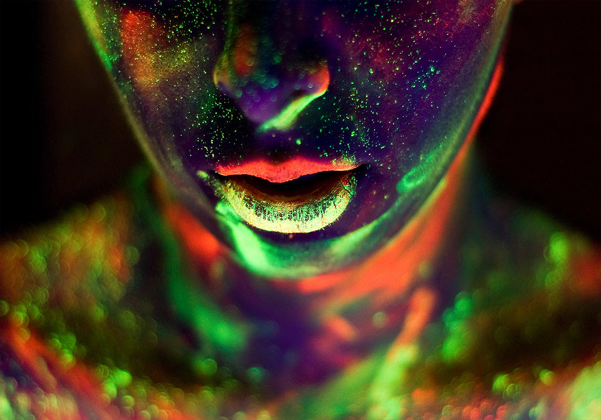 E markant Portrait deen ënner UV Liicht glanzt, wou Neonfaarwen d'Gesiicht an e kosmesche Leinwand transforméieren. Vibrant Gréng, Feierrout a brillant Giel beliichten d'Haut a kreéieren eng surrealistesch Mëschung vu Geheimnis an Intensitéit. Dëst fett Konschtwierk feiert Faarf, Liicht a mënschlech Kraaft.