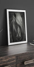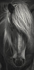 E markant schwaarz-wäiss Porträt vun engem islännesche Päerd, mat der Mane no vir an engem stilvollen, windswept Look. Déi monochrom Téin ënnersträichen déi rau Textur vun den Hoer an déi roueg Kraaft vum Déier, fir e fett awer intimen Déiereportrait ze kreéieren. Perfekt fir Naturliebhaber a minimalistesch Interieuren.