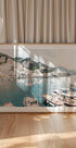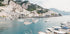 Eng atemberaubend Foto vun der Amalfiküst, wou pastellfaarweg Haiser iwwer de Fielsen klammen a Schëffer friddlech am türkisbloe Waasser schwiewen. D'Szen erfaasst d'Essenz vum italienesche Summer - eng harmonesch Mëschung vu Küst Charme, Architektur an der Rou vum Mëttelmier.