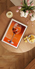 E lieweg orange Konschtdruck mat engem Glas Aperol Spritz, Äiswierfelen an enger frëscher Orangescheif. Dëst frësch a summerlech Konschtwierk bréngt e Goût vum Summer an d'Haus - perfekt fir Kichen, Baren a modernen Interieur mat enger lieweg Atmosphär.