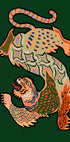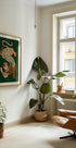 Eng markant abstrakt Illustratioun vun engem stiliséierte Tiger a liewege Faarwen, op e staarke gréngen Hannergrond gesat. D'Konschtwierk kombinéiert geometresch Mustere, fléissend Linnen a liewege Texturen fir eng modern Interpretatioun vum katzegeescht ze kreéieren. En eenzegaartegt Déier-inspiréiert Konschtstéck fir d'Liebhaber vum modernen Design.