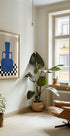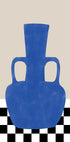 E fett modernt Konschtstéck mat enger déifbloer Vase géint e minimalistesche beige Hannergrond an engem markantem schwaarz-wäiss gekackte Buedem. Kombinéiert Abstraktioun mat Innendesign Ästhetik, dëst geometrescht an zäitgenëssesch Stilleben erstellt e stilvollen visuellen Brennpunkt.
