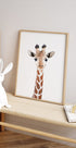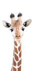 E schéine High-Key Portrait vun engem Giraff Kallef ageholl géint e pure wäissen Hannergrond. Déi elegant Musteren, sanft Aen a laangen Hals markéieren d'Gnod an d'Schéinheet vun dësem jonke wëll Déier. Perfekt fir de Kannerzëmmer, Déierefrënn oder modern minimalistesch Interieuren.