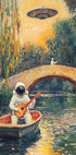 Eng surreal impressionistesch Stil Molerei vun Astronauten an enger Äerdlandschaft. En Astronaut sëtzt an engem Boot a spillt Gittar, während en aneren vun enger Steebréck ënner engem gëllenen Himmel gestéiert. Iwwer hinnen hieft en UFO, deen Science Fiction mat Konschtgeschicht an enger humoristescher a imaginativer Szen kombinéiert.
