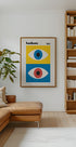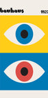 Eng markant Bauhaus-inspiréiert Plakat mat zwee stiliséierter Aen a staarke Faarfblocken vu giel, blo, rout a schwaarz. Dësen abstrakte Design erfaasst d'Essenz vum Bauhaus 1923, mat enger Kombinatioun vu minimalistesche Formen a markante Kontraster. Perfekt fir déi déi vintage, ikonesch a modernistesch Design gär hunn.
