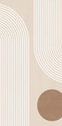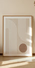 E modernen, minimalistesche Konschtdruck mat mëllen beige Téin, propper wäiss Bogen an engem geometresche Krees. Den einfachen Design, inspiréiert vum Mëtt-Joerhonnert modern, gëtt Balance an Eleganz zu all Mauer an ass perfekt fir neutral Interieur a bohemian-inspiréiert Raimlechkeeten.