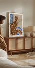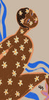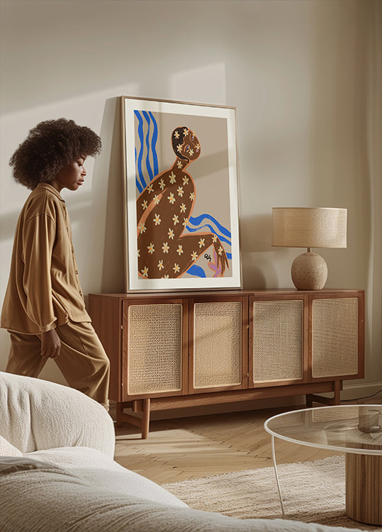 E liewegt, figurativt Konschtwierk, dat eng mënschlech Form ausmécht, bedeckt mat bléien Daisies. Déi Äerdtéin vun der Figur kontrastéieren mat helle bloe Linnen, déi Bewegung an Energie addéieren. En eenzegaartegt an expressivt botanesch-inspiréiert Wierk dat Blummen a mënschlechen Ausdrock kombinéiert, perfekt fir modern Interieur.
