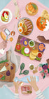 Eng lieweg Illustratioun déi d'Freed vum Brunch mat Frënn ronderëm e faarwegen Dësch erfaasst. Vu Ramen an Tacos bis Croissanten a frësch Uebst, dëst Konschtwierk feiert d'global Kichen a Gemeinschaft, ënnersträicht d'Iessen als Ernärung an eng gemeinsam Erfahrung vu Léift a Frëndschaft.
