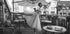 Eng graziéis Ballerina poséiert op enger Café-Terrasse an dëser eleganter schwaarz-wäiss Foto. Eng Kombinatioun vun Danz, Architektur a Stadliewen an engem Café entsteet e poetesch an zäitlos Konschtwierk.