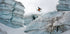 En atemberaubende Action Shot vum Freestyle Skier Candide Thovex, deen duerch d'Loft tëscht risegen Äis Gletscher schwëmmt. Shot zu Chamonix, Frankräich, dëst Bild erfaasst den Adrenalin, d'Fäegkeet an den Angschtlosen Geescht vum Wantersport. Déi gefruer Landschaft an d'Schwéierkraaft-verdeedegt Sprong maachen et zu engem ikoneschen Hommage un Abenteuer an extrem Ski.