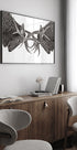 Zwee Moos treffen Aen zu Aen, Geweier an engem intensiven Wanterduell gespaart. Schwaarz-Wäiss ginn déi rau Kraaft, de gefruerenen Atem an de rouege Glanz vum Schnéi ënnerstrach, während d'Spannung an der Loft vibréiert. Den Naturfotograf Jim Cumming erfaasst de Moment mat grafescher Kloerheet an dramatescher Präsenz - wëll Schéinheet um Rand vum Konflikt.