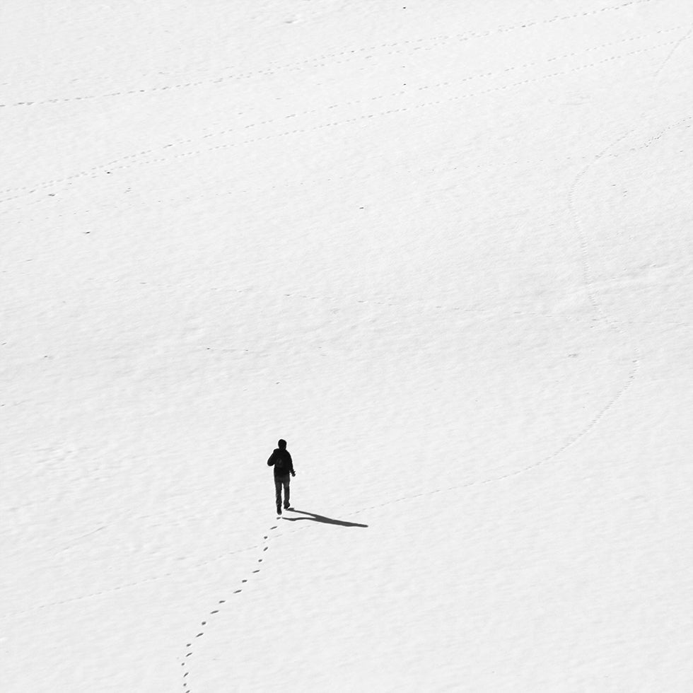 Eng poetesch, schwaarz-wäiss Loftfoto vun enger schneeger Landschaft, wou eng eenzeg Persoun an hir Foussofdréck duerch déi wäiss Rou schneiden. Déi laang Schatten an héije Kontrast kreéieren eng minimalistesch Rou a Gefill vun Taucht. Eng zäitlos Wanterkompositioun vum MOSTAFA NODEH. D'Motiv balanséiert d'Stille an d'Opreegung an engem grafeschen, schneege Raum.