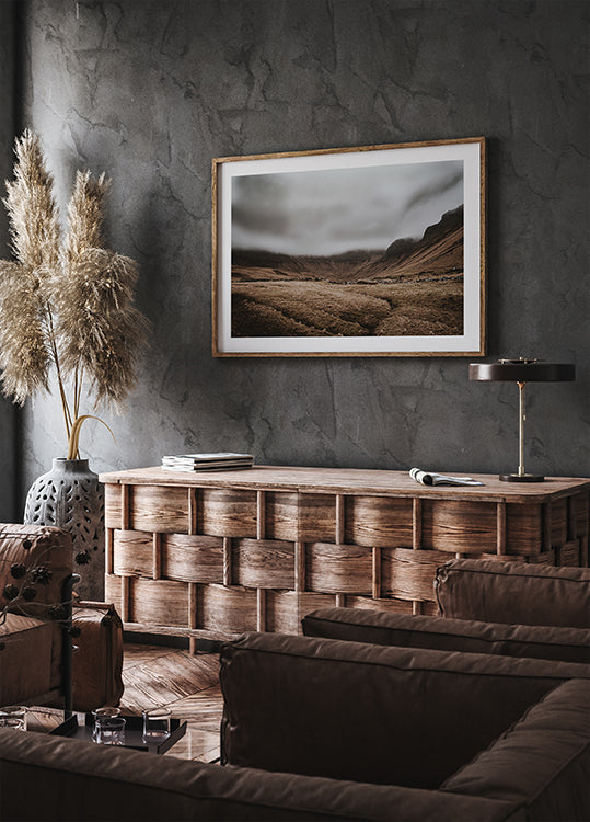 Eng dramatesch Landschaft op de Färöer Inselen mat rauen Hiwwelen an engem risegen Grasdall ënner enger décker Decken vun déif hänkege Wolleken. Déi gedämpft Téin an déi rau Schéinheet erwecken e Gefill vun Isolatioun an onberéierter Wildnis, perfekt fir Themen wéi d'Gréisst vun der Natur an déi wäit Rou.