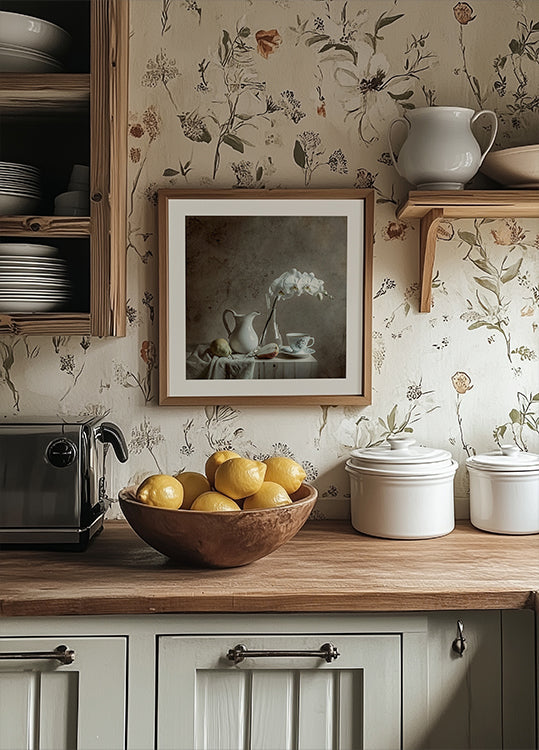 Al Mauer vum Margareth Perfoncio erfaasst e Stilleben virun enger verschleefter, wäissgewäscher Mauer: en Dësch mat engem mëllen Dëschtuch, delikate Coupë, Brëller an enger helle Vase mat Orchidee a Biren. Muted, natierlech Nuancen an e mëllt, schréiegt Liicht schaaft Rou, Poesie an zäitlos Eleganz fir d'Kichen, Wunnzëmmer an Iesszëmmer. Perfekt fir eng roueg, nordesch Atmosphär.