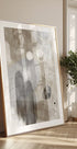 E modernt, abstrakt Motiv, wou organesch Kéiren a grafesch Linnen sech an en eleganten Twist verdréien. Schichten vu mëllen Äerdtéin treffen déif blo-gréng Téin, gebrach duerch helle Highlights. Subtile Texturen a Pinselstrécke kreéieren roueg Bewegung - e stilvollen Aenfanger fir nordesch, minimalistesch Plazen. Perfekt eleng oder als Deel vun enger Galerie Mauer.
