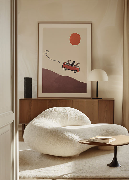 Žaismingas ir nuotaikingas plakatas su šunimis, vairuojančiais raudoną VW autobusą per kalnus po stipria saule. Savo keistu koliažo stiliumi, retro atmosfera ir smagiomis išraiškomis meno kūrinys užfiksuoja laisvės, nuotykių ir draugystės dvasią.